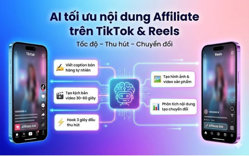 Trên mạng xã hội và video ngắn, AI giúp viết caption bán hàng tự nhiên, tạo kịch bản video 30–60 giây, gợi ý hook thu hút trong 3 giây đầu, đồng thời tạo hình ảnh và video sản phẩm bằng AI. Bên cạnh đó, AI còn phân tích nội dung nào đang mang lại chuyển đổi tốt nhất, giúp người làm affiliate tối ưu chiến lược nhanh chóng. Điều này đặc biệt quan trọng trong bối cảnh TikTok và Reels đang trở thành nguồn traffic chính cho affiliate marketing.