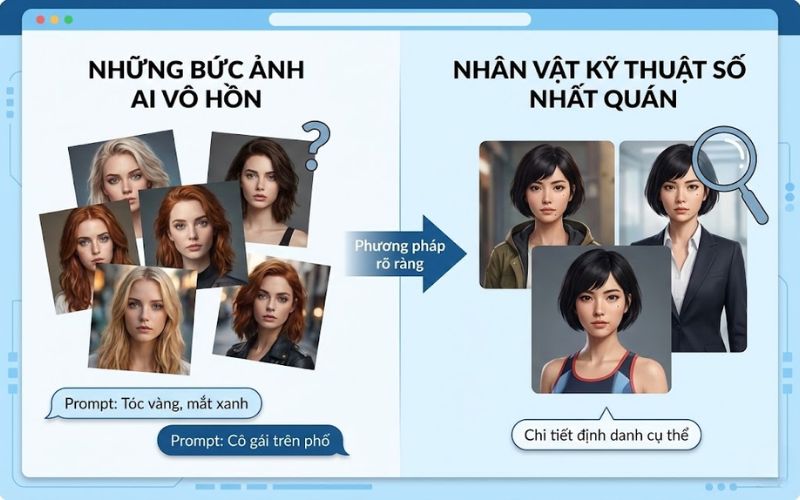 Cách làm sai (Prompt mới): "Một cô gái tóc vàng đang uống cà phê ở Paris." -> AI sẽ tạo ra một cô gái tóc vàng ngẫu nhiên khác.