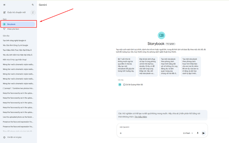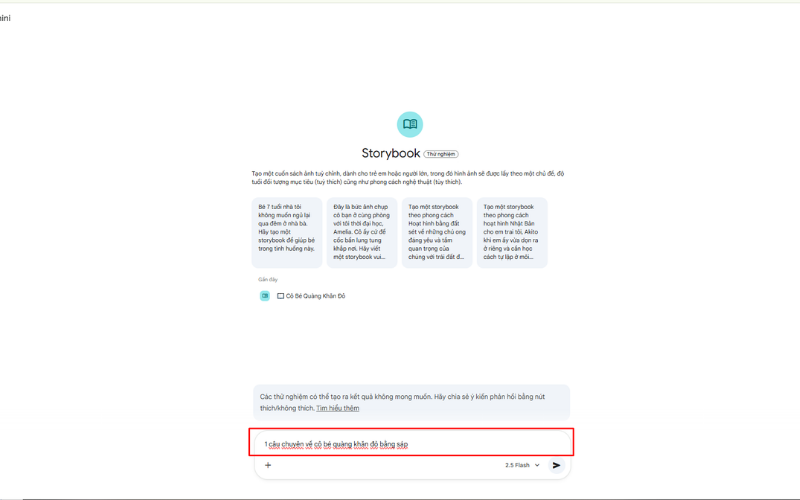 Truy cập vào địa chỉ gemini.google.com bằng tài khoản Google của bạn. Sau khi đăng nhập, chọn chế độ Storybook trong menu. Đây là công cụ chuyên biệt cho việc sáng tạo truyện tranh và sách minh họa.